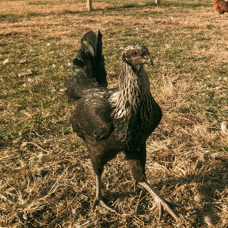 The Indio Gigante is a Brazillian, hard feathered chicken breed with feathers held closely to their bodies and minimal down producing a lean and narrow appearance. Rooster can measure up to 36"+ with their tall necks and super long legs but typically measure around 30". Their heads are narrow and faces have a "curious" expression with flat, wide combs. This breed has clean legs yellow or slate legs. Due to their lack of downy feathers, they typically need more consideration in colder months.